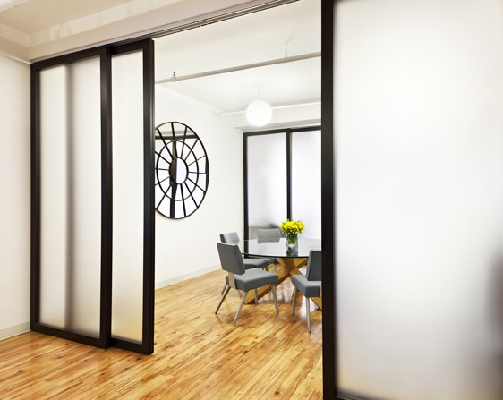 Our sliding bypass doors have a maximum panel size of 5’ × 10’, though multiple panels can be used together to accommodate large openings or rooms.