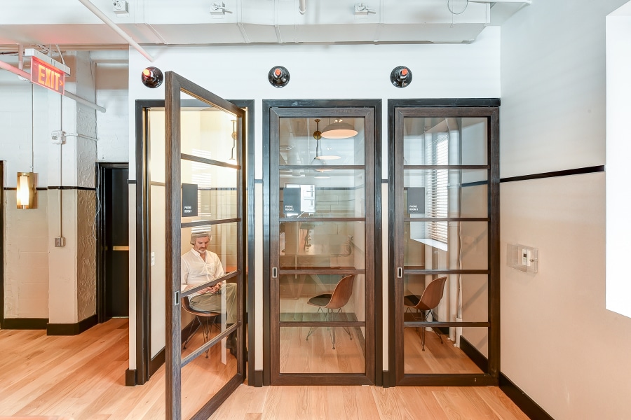 Our swinging pivot doors have a maximum panel size of 4’ × 10’, though multiple panels can be used together to accommodate large openings or rooms.
